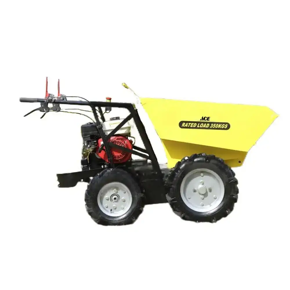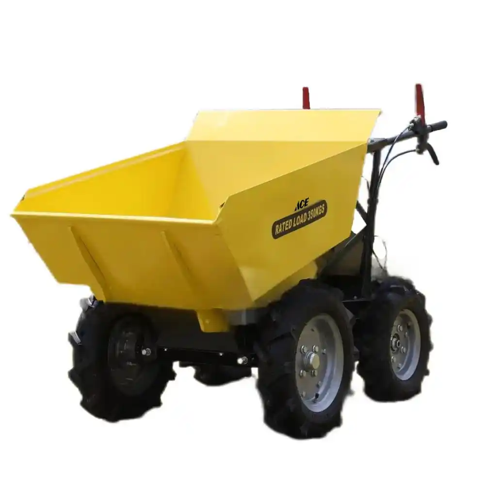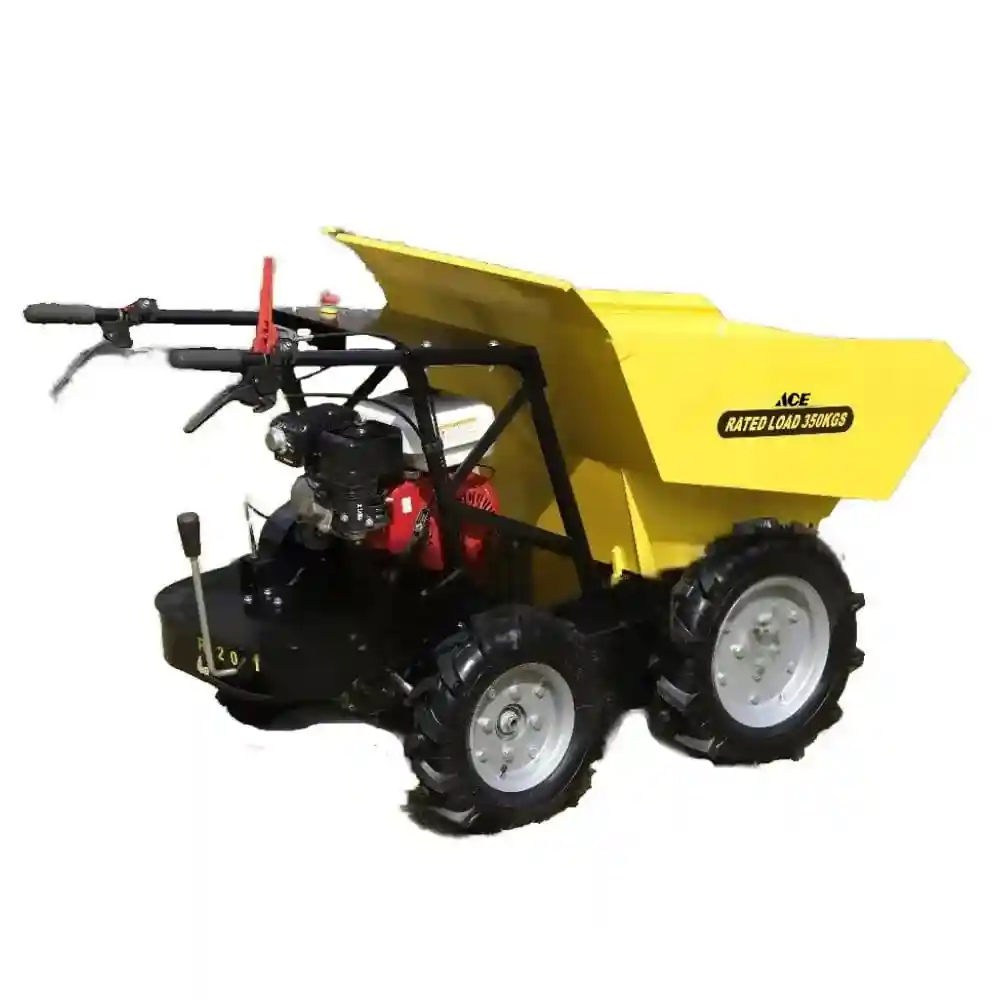 This powered wheel barrowBY350 is hydraulic design and 4wheels driven. The main parts are imported from USA with global warranty. The max loading weight is 350kgs and the width is 78cm narrow. It’s powerful to carry bricks, sand, stones, wood, crops, fruits around varous sites. There are rich accessries to add the value, such as flat bed, extension sides, snow plough, ball hitch, power lift and so on.