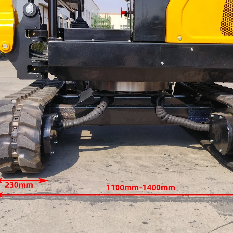 The 2 ton mini excavator with telescopic chassis allows width adjustment between 1100 mm and 1400 mm, improving access through narrow areas while providing stability for digging.